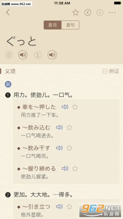2、双向查词超高效:日汉汉日双向查词服务,融入智能联想技术,输入中文意思也能查到单词,一站式查遍词目、短语、例句。