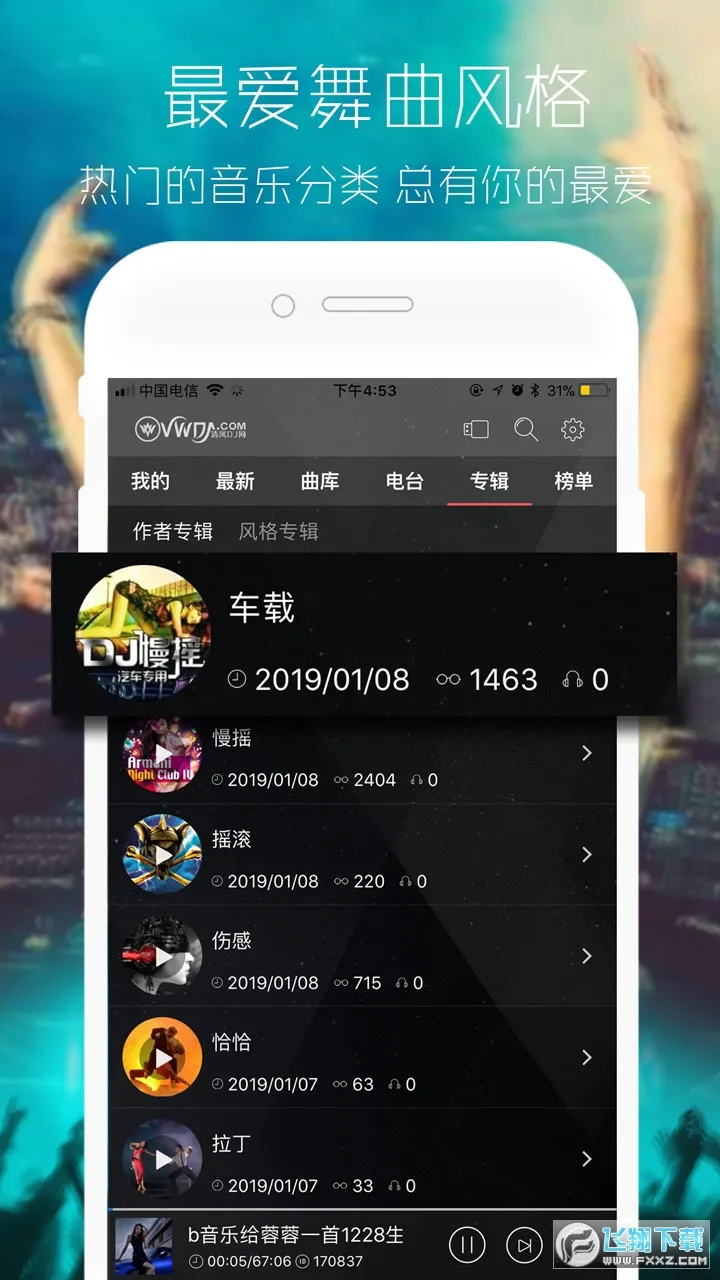 海量资源:拥有多年累积的16万舞曲库,各类风格舞曲应有尽有,每日更新大量热门歌曲专辑,让你时刻畅享最新音乐。