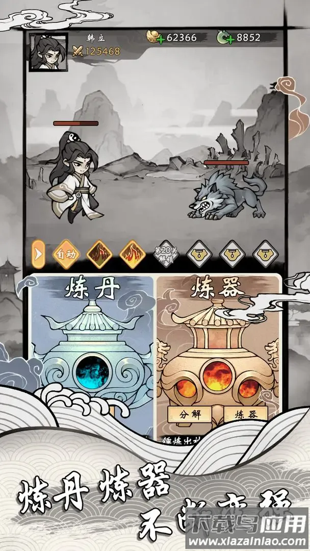 这是一款水墨画风的修仙游戏。开局送超凡脱俗外挂,如天灵根、天生道体等,还有各类法宝任挑,定制独特修仙传奇。游戏含炼丹炼器等丰富元素,能参与师门任务等。可给装备法宝升级,解锁珍稀法宝与强大法术,从炼气期修炼到化神期。设有多方势力与种族纷争,玩家可加入角逐。保留传统修真精髓,结合创新外挂机制与丰富玩法,不肝不氪可挂机修仙。