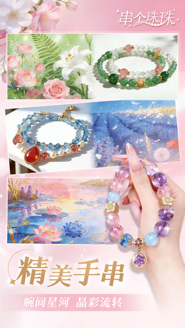 串个珠珠2026官方正版游戏中,玩家化身手串摊主,依顾客订单用各类珠子定制手串,通过小游戏解锁材料,升级摊位,还能社交互动、作品PK,集经营、创意、休闲于一体,体验制作与经营乐趣。