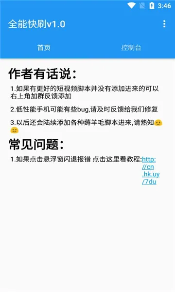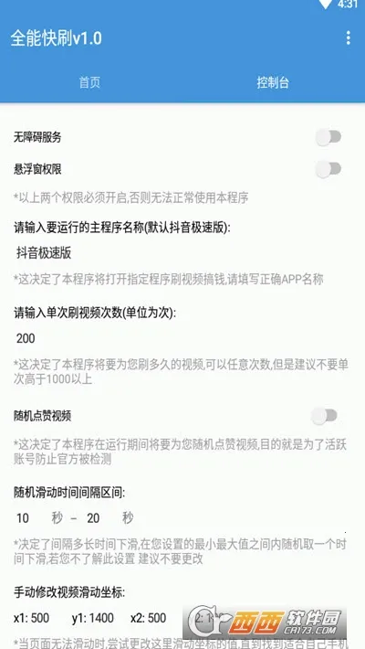 全能快刷是一款超实用的手机自动化脚本工具app。它能支持软件全自动刷短视频等,还支持多种挂机功能和辅助项目,大大减轻了重复操作负担。