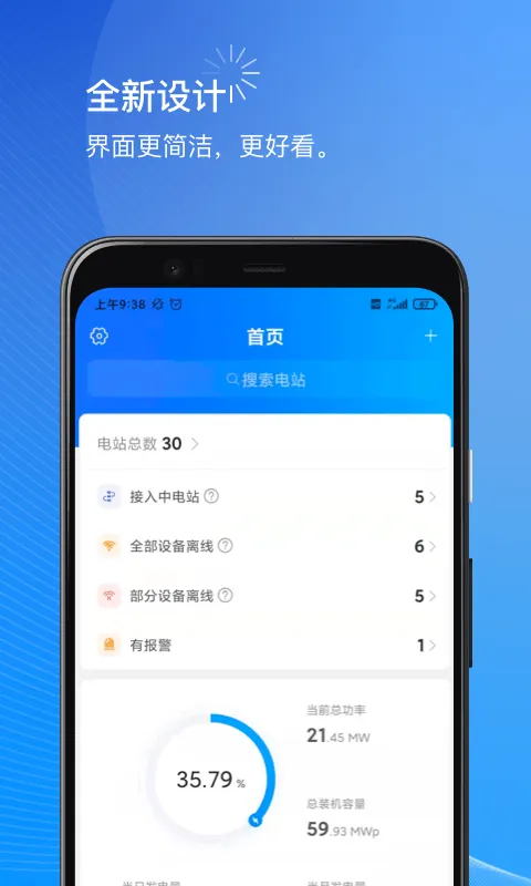 3 能智能统计发电情况,直观查看设备运行及报警情况,通过图表反馈发电数据,便于分析。