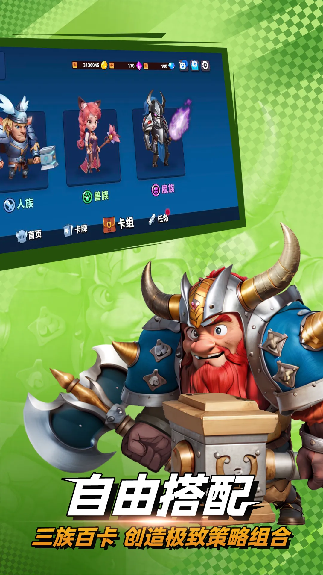 2. 三大种族体系:人族、兽族、魔族各具特色,拥有专属英雄、建筑与法术卡牌,形成差异化战术流派,如兽族护盾流、魔族旋晕控制等。