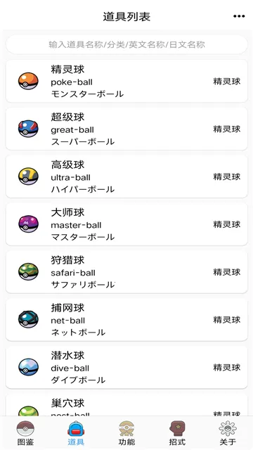 不仅有宝可梦基本信息,还包含技能列表、道具列表、特性列表等丰富内容,如道具类别依在游戏中包包口袋划分。
