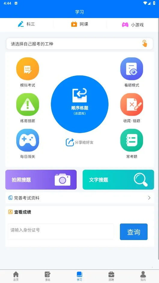 3. 助力提升:能实时查询学习进度,知晓自身学习状态;做错的题目及时记录,可反复练习降低容错率;提供证书认证服务,输入个人信息就能查询职业资格证书。