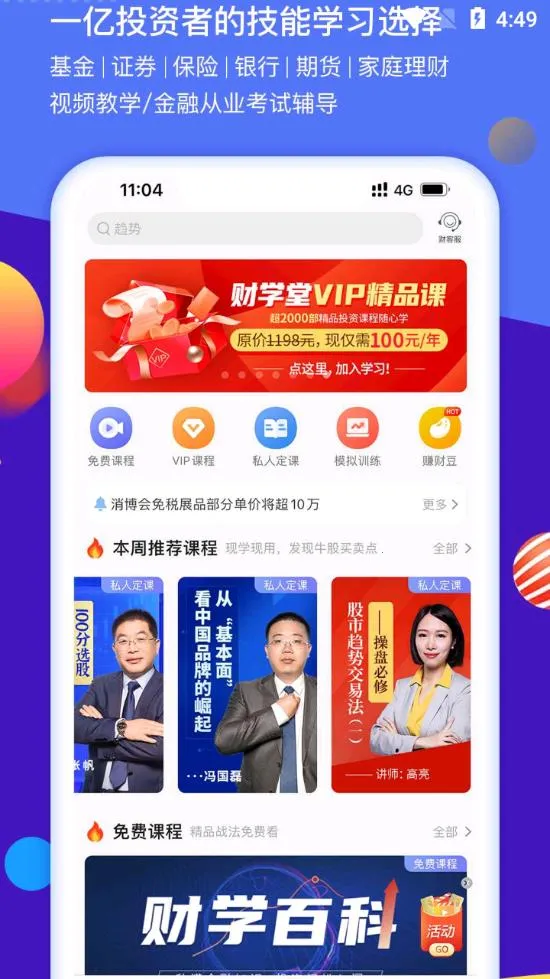 财学堂安卓版是国内权威在线投资者教育平台,邀请金融名师授课,有海量高清课程,覆盖多金融行业。功能丰富,如提供免费课程、VIP功能、私人订课等,还有财社区、赚财豆等特色,助投资者提升实战成功率。