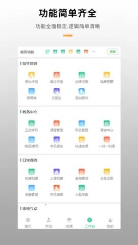 在招生营销上,有海量活动模板吸引生源;排课消课灵活,支持多种方式;学员管理方便查看档案。家校互动便捷,消息自动推送,还能上传多种形式的课堂点评。财务分析能让你实时掌握经营关键指标。而且它支持多校区统一管理。