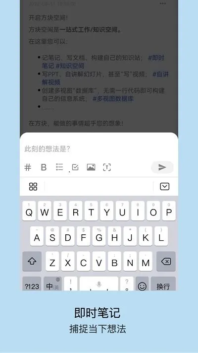 方块致知灵感笔记是适用于办公学习的记事本软件,能便捷记录会议等内容,标记阅读重点。有自动分类、智能推荐等亮点,可即时笔记、保存文章,模拟手写,还能插入素材,打造一站式工作学习空间。