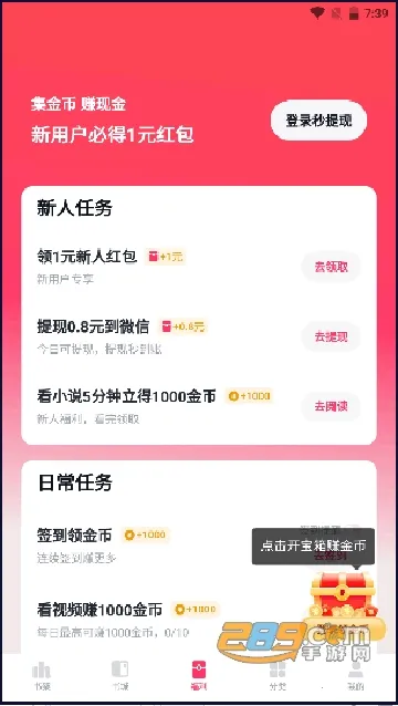 3. 免费畅读:所有图书资源免费提供,新用户还有现金红包,签到阅读能赚大量金币且提现秒到账。