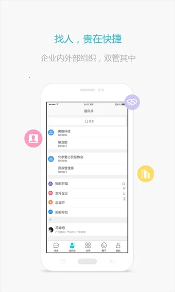 企业社交放心:通讯录对企业内部组织架构群组友好,企业合作伙伴挂靠机构有序分类管理,找人更快捷。公开通讯与专人交流相结合,让企业合作更安心。