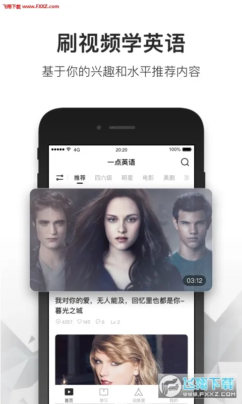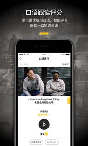 3. 智能学习提能力:无字幕逐句精听,可反复听、降倍速、自由切换语速;影视原声跟读,AI评分反馈效果,提升听力与口语能力。