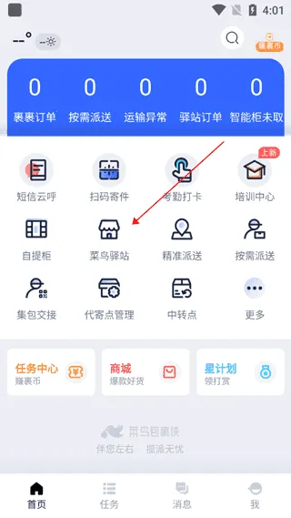 2、进入首页后,点击底部导航栏中的“菜鸟驿站”入口