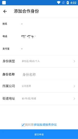 5、按页面提示如实填写驿站名称、地址、负责人信息等资料,勾选《服务协议》后,点击“提交申请”即可完成流程