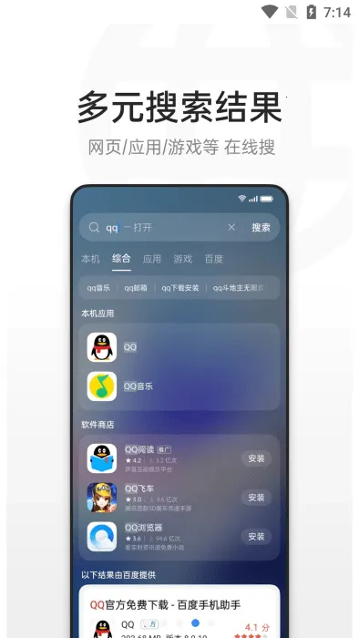 3. 广泛的在线搜索:应用软件一键安装,快应用瞬间开启,网页内容一键直达。