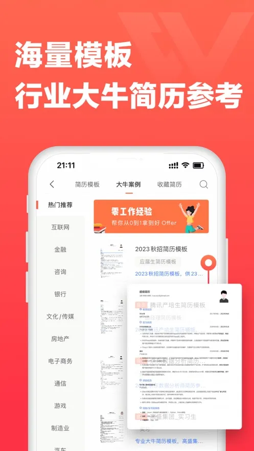 为不同阶段和行业求职者定制:涵盖在校生、应届生、有工作经验者等,针对金融、互联网等热门行业,提供适配各场景的模板与指导。