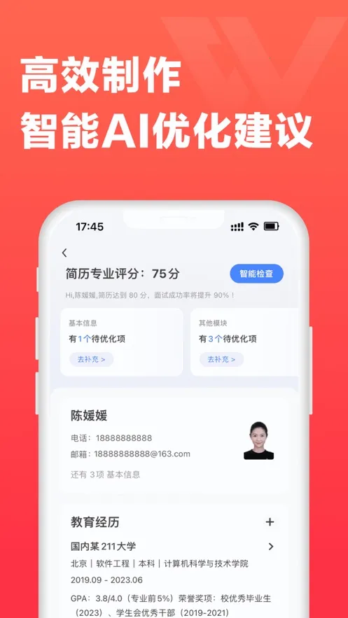 智能功能强大:具备智能简历建议、中英双语一键翻译、自动排版、智能打分及优化反馈等功能,提升求职效率与成功率。