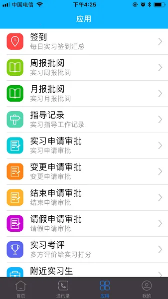 习讯宁夏是一款专业的顶岗实习管理平台,由万博云信北京教育科技有限公司开发。它聚焦高校顶岗实习需求,依托领先的SaaS服务技术,为宁夏地区高校提供线上实习及相关项目追踪管理等功能。其优势显著,是全国使用院校和学生数量领先的实习过程管理和交流平台。能助力学校进行顶岗实习过程管理,方便学生在线完成实习作业并与老师互动交流,让学校实习管理无忧,学生实习轻松无忧。通过它,老师可在线审批请假申请等,还能查看学生签到汇总数据等,消息通知及时,功能全面易用。