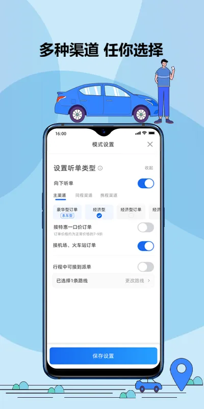2、操作简单:软件操作流程易懂。进入模式设置界面选定相关选项后保存设置;按导航指引前往上车点,到达点击接乘客并开启双闪;前往约定地点,通过消息或电话联系乘客;还能再次进入模式设置调整接单选项。简单几步,轻松上手。