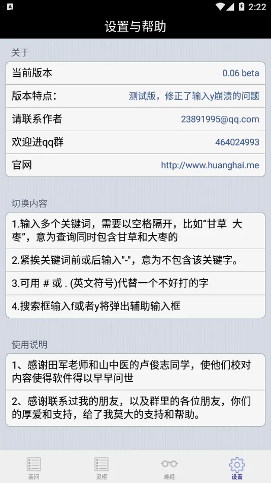 内经查阅app可随时查阅和搜索黄帝内经难经各条文。完全免费无付费内容,为学习和研究中医的朋友提供便利。能通过数字、文字、关键词定位相关内容。使用时注意:输入多个关键词需以空格隔开;紧挨关键词前或后输入“-”表示不包含该关键字;可用“或”“.”代替不好打的字;搜索框输入f或y弹出辅助输入框。它涵盖素问、灵枢、难经等内容,页面复古,还可搭配伤寒论查阅app,是学习中医的得力工具。