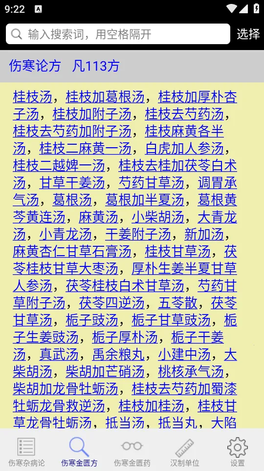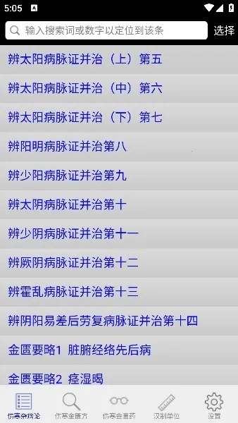 伤寒论查阅app是为方便中医从业人员及爱好者查阅研究伤寒论和金匮要略而开发。整合398条伤寒论原文及113方等内容,支持多种搜索方式,条文点击可操作,还有汉制单位介绍,功能丰富实用。