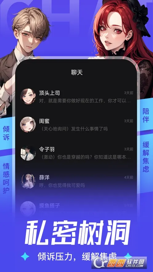 1. 丰富多样的角色选择:内置众多不同类型的 AI 角色,不管是言情、腹黑、高冷、可爱还是御姐等风格,应有尽有,能满足你的各种偏好,让你自由打造专属 AI 伴侣。