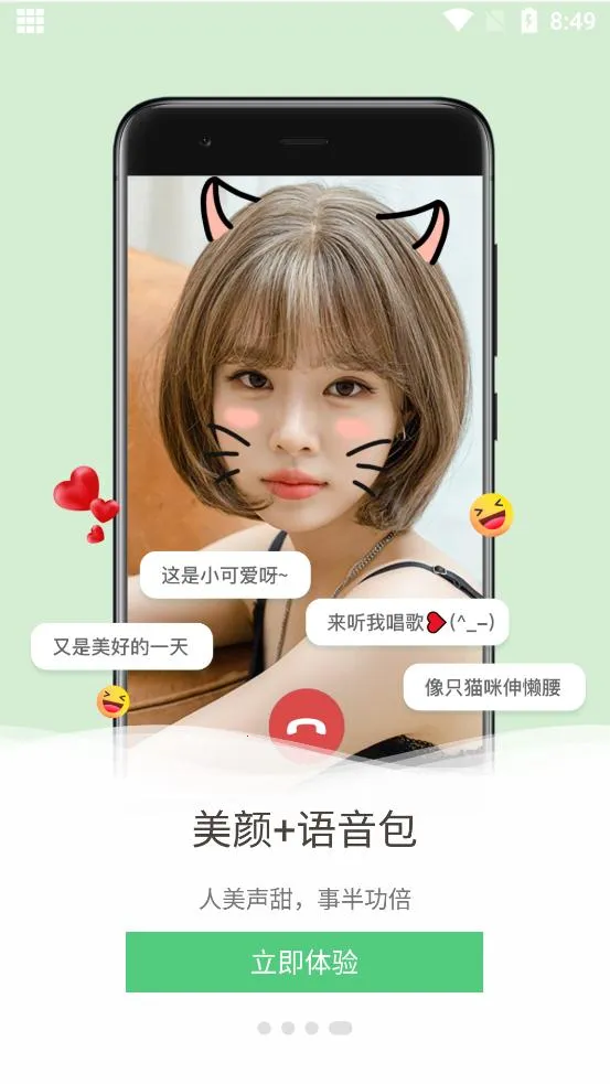 2、丰富特效,趣味十足:拥有30款可爱动态贴纸、50款网红滤镜效果,还有超好玩变声功能,大叔音萝莉音等随意切换,让视频聊天更有趣。