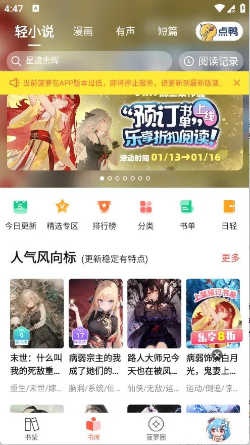 菠萝包轻小说app是国内老牌轻小说站点SFacg打造的手机追书软件,收录超十万本轻小说,涵盖多种主题分类。支持有声阅读,有各类榜单推荐,能wifi传txt,还有书评区等,满足阅读需求,助你摆脱书荒。