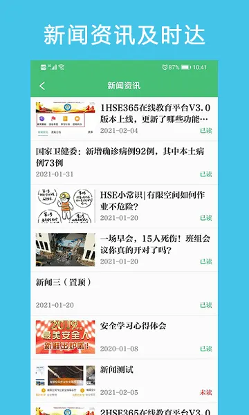 HSE365是一款超棒的安全教育平台app。它能帮咱在线学习各类安全知识,不管是内部课程还是公开课程都有。在这里,能制定详细的学习计划,安全生产、危化品隐患排查等知识全涵盖,还有安全生产法知识题,能在线测评。它基于互联网安全生产思维和技术,为企业和公共组织打造一站式数字化安全管理服务平台。有体系化矩阵式课程,适应员工新习惯;是知识共享平台,能建设专业知识体系;联合化工大学仿真中心助力建设线下安全实训仿真空间;万人可同时在线考评;还有社交化资讯中心聚合HSE知识助力企业安全文化建设。咱能自主筛选全部安全教育课程,在线阅读资讯,制定个人学习计划,快速找到内部课程,随时在线学公共课程,完成任务还能获积分换礼品,学习超方便!