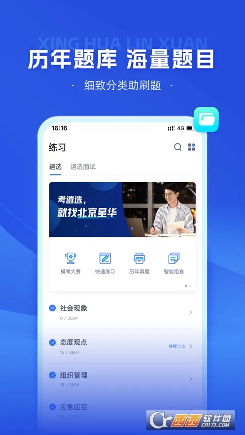 星华遴选最新手机版是专为公务员考试定制的备考神器。有海量真题、丰富课程,支持在线搜索题库,还有招聘信息。名师指导,功能多样,能优化简历、关注考试动态,助你高效备考,增加就业机会。