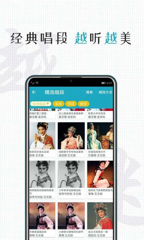 拥有海量丰富的越剧资源,涵盖经典唱段音频、全本舞台剧、大戏折子戏、戏曲电影电视剧等,还有众多戏曲名家名段,以及各类戏曲电视节目,资源丰富多样。